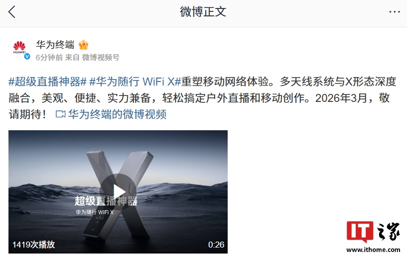 IT之家 12 月 24 日消息,华为终端刚刚官宣了一款新品 —— 华为随行 WiFi X。根据官方描述来看,这款新品定位是直播神器,适用于户外直播和移动创作,将在 2026 年 3 月发布。